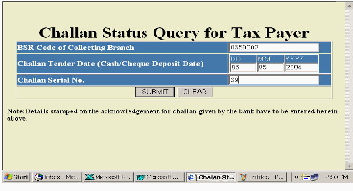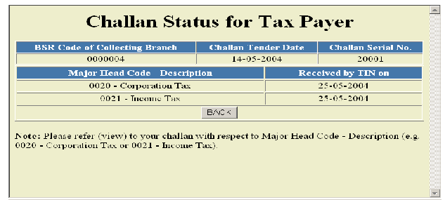 Tax Information Network (TIN), being established by National Securities Depository Limited (NSDL), provides a facility to the tax payers to inquire about the status of their challans over internet. Tax payers have to log on through http://tin.nsdl.com to view whether the challan for the tax payments is received by TIN. The following are the steps for viewing challan status: